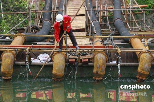 6月7日下午,四川省遂寧市明星自來水公司員工正在打撈渠河新增取水口的雜物,隨時準備在渠河深處取水。為了應對唐家山堰塞湖險情,處于下游的遂寧市及時多次組織群眾開展撤離疏散大演習,實際轉移群眾19186人,并在10小時之內迅速開辟出第二水源。如果堰塞湖泄洪,遂寧市民唯一的自來水水源--涪江水質將造成污染。第二水源400萬方蓄積水源將可保證市城區生活用水60天以上。中新社發 鐘 敏 攝