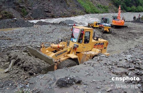 因近日連續暴雨,前不久剛剛搶通的5·12大地震重災區臥龍至耿達的簡易公路多處被泥石流、坍方沖斷,武警交通直屬工程部緊急出動工程機械搶通。圖為裝載機在一處厚達3米多、寬近300米的泥石流堆積層上為后續機械開出一條通路。中新社發 江湖 攝