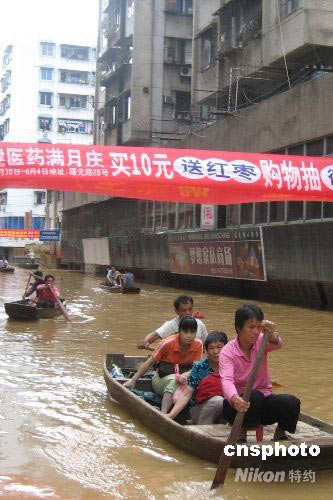 六月十六日,西江水已超警戒水位六點(diǎn)五米的洪峰流經(jīng)廣東封開(kāi)后,封開(kāi)舊城區(qū)仍被水淹,居民出行只能以舟代步。中新社發(fā) 黃耀輝 攝