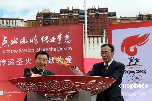 6月21日,奧運火炬在西藏拉薩進行傳遞。在傳遞終點布達拉宮廣場舉行的奧運史上首次熔火儀式上,中共西藏自治區(qū)黨委書記張慶黎與西藏自治區(qū)主席向巴平措,分別將由登頂珠峰的火種和在境內(nèi)接力傳遞的火種點燃的兩支火炬,在圣火盆中相熔點燃。 中新社發(fā) 廖攀 攝