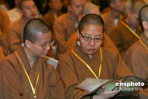 7月9日,“2008年佛教外語(yǔ)交流會(huì)”在上海玉佛寺舉行,海內(nèi)外百余位佛教界代表濟(jì)濟(jì)一堂,以英、韓、日等多種語(yǔ)言暢談開展國(guó)際交流的經(jīng)驗(yàn)與心得。以佛光山為首的臺(tái)灣地區(qū)佛教界的二十余名外語(yǔ)人才代表,也應(yīng)邀出席。圖為來(lái)自臺(tái)灣的覺(jué)楷法師(左)和有智法師(右)在交流會(huì)上。中新社發(fā) 湯彥俊 攝