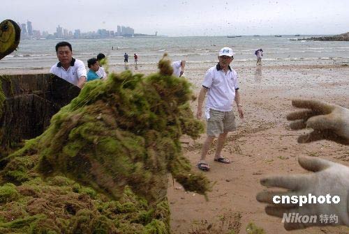 7月19日,青島第三海水浴場,志愿者們正在清理殘余的滸苔。自5月下旬以來,黃海中部海域出現大規模漂浮的滸苔,在青島市近海海域形成了大片聚集區。為了及時清除滸苔,努力將滸苔的不利影響降到最低,青島市近日出動千余艘各類船只,穿梭在滸苔飄浮的海面,在海上進行拉網式打撈。在大片的滸苔聚集區,采用圍油欄攔截滸苔,使清除滸苔的的速度明顯提高,確保在規定的時間內清除滸苔,為舉辦奧帆賽創造良好的海域環境。 中新社發 廖攀 攝