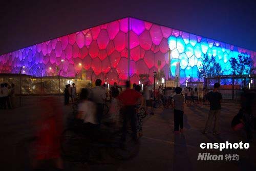 7月25日,隨著北京奧運會的臨近,奧運場館“水立方”五顏六色的彩燈在夜色中交相輝映,變幻萬千,令北京的夜晚愈加迷人。中新社發 九州 攝