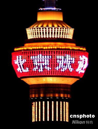 8月1日晚,北京中央電視塔奧運主題夜景燈光以“燈籠”造型為主體,將405米高的世界高塔裝扮得美輪美奐,無比壯觀,成為京西一道綺麗奪目的風景。中新社發 趙振清 攝