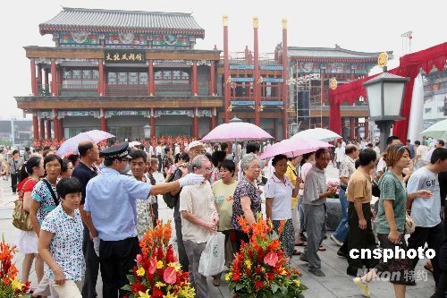 8月7日,眾多北京市民及外地游客在警察的疏導下,有次序地參觀改造后的北京前門大街。當日,北京前門大街正式對外開放。經過2年多的擴建、改造,老牌樓、有軌電車、老字號店鋪重現老北京時的風貌。中新社發 史利 攝