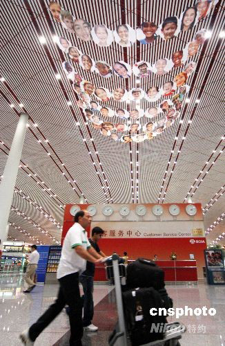 8月26日,北京首都機場三號航站樓內“笑臉”懸掛,缶樂齊鳴,一片歡樂的海洋,歡送奧運大家庭成員回國。 中新社發 吳芒子 攝