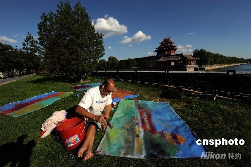 8月31日,北京天氣晴朗藍天中漂浮著朵朵白云,新加坡籍殘疾人Gregory Burns坐在故宮北門外的綠地上為藍天白云下的北京城作畫。中新社發 廖攀 攝