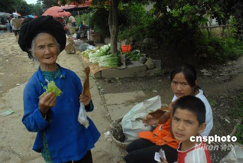 8月31日是四川攀西地震發(fā)生后的第二天,也是地震災(zāi)區(qū)當(dāng)?shù)剜l(xiāng)鎮(zhèn)趕集的日子。在距離震中約四十公里的地震災(zāi)區(qū)大龍?zhí)多l(xiāng)村民照常趕集,購買日常用品。圖為當(dāng)?shù)匕耸啐g的李姓老人帶著孫子、孫女到集市吃小吃。中新社發(fā) 保旭 攝