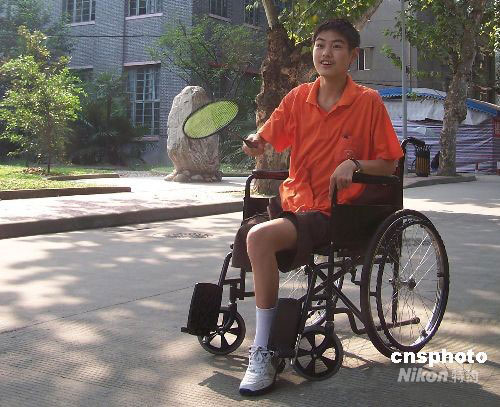 9月5日,受中國殘疾人聯合會邀請,在四川汶川大地震中受傷的四位少年赴北京參加殘奧會開幕式。圖為4日下午,在華西醫院地震傷員康復中心,來自北川中學的十七歲少年王飛正在打羽毛球。中新社發 伊西科 攝