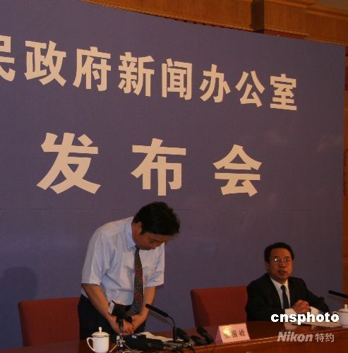 9月15日下午,在河北省政府舉行的新聞發(fā)布會上,石家莊三鹿集團副總裁張振嶺宣讀了《石家莊三鹿集團股份有限公司致社會各界的公開信》,就“問題奶粉”事故向社會各界人士及廣大消費者表示最誠摯的道歉,并鄭重聲明:三鹿集團對8月6日以前生產(chǎn)的產(chǎn)品全部收回,消費者如對8月6日以后的產(chǎn)品有異議、不放心,也將收回。同時,三鹿集團將不惜代價積極做好患病嬰幼兒的救治工作。圖為張振嶺鞠躬致歉。中新社發(fā) 高新國 攝