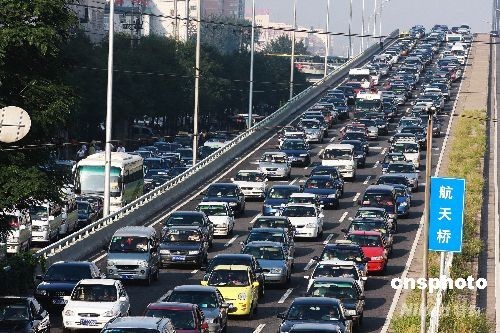9月22日早8時15分,北京航天橋上下車流擁堵。當日,是北京單雙號限行措施解禁首個工作日,北京市各條道路恢復至平時早高峰交通流量。此外,因諸多原因,北京市將面臨更大交通壓力,交管部門推出九大措施應對奧運后交通。中新社發 鄭雄增 攝