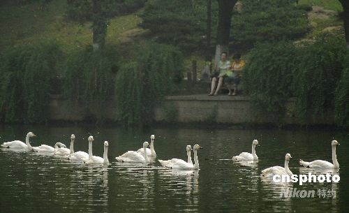 9月23日,天鵝在西湖湖面暢游。當(dāng)日,28只天鵝在闊別西湖3年后重返西湖。據(jù)了解,2005年秋天,有關(guān)部門在西湖孤山處放養(yǎng)了80只白天鵝,為西湖增添了一道風(fēng)景。但后來因?yàn)閭(gè)別地方出現(xiàn)禽流感,有關(guān)部門就把白天鵝圈養(yǎng)了起來。中新社發(fā) 引煒 攝