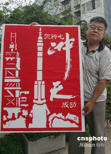 9月27日,江蘇徐州市民間工藝美術師陳永年用一天半時間,剪出了“賀神七沖天成功”和翟志剛、劉伯明、景海鵬三位航天員個人肖像剪紙畫,以此慶賀“神七”飛天成功。中新社發 人石 攝