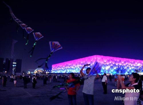 北京市民在十一國慶長假夜晚,在北京奧運會主游泳館國家游泳中心“水立方”外放飛風箏。中新社發 賈國榮 攝
