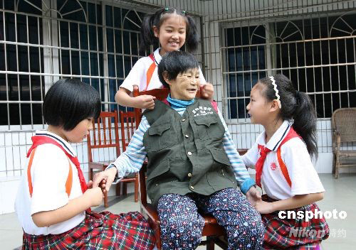 10月7日,由四川省廣安市廣安區東方小學的10多名少先隊員組成的愛心志愿者小分隊來到濃洄敬老院,看望生活在這里的40多位老人,為老人送上節日禮物,為老人打掃房間,陪老人聊天、散步,為他們送去重陽節的祝福,陪伴他們度過災后首個重陽節。 中新社發 杜修戰 攝