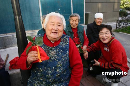10月7日,北京東四街道辦事處的工作人員親手為社區老人送上自己制作的茱萸囊,祝愿老人重陽節愉快。重陽節登高、吃重陽糕、喝菊花酒、佩戴茱萸囊等,是中國民間傳統的重陽節習俗。中新社發 杜洋 攝