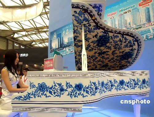 10月9日,身穿旗袍的美女在上海樂器展中彈奏鋼琴。琴身上描繪著中國傳統青花瓷紋飾,透出濃郁的古典韻味。 中新社發 井韋 攝