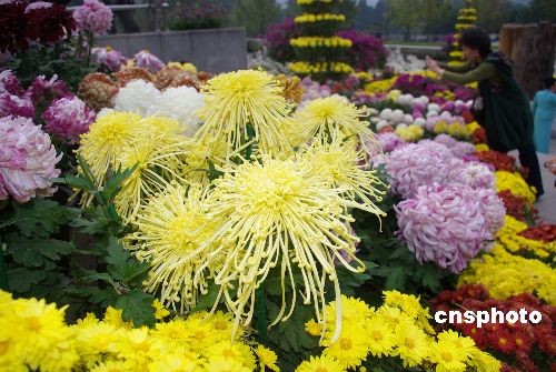 10月13日,游客在北京植物園菊花展區內流連忘返,頻頻發出贊嘆之聲。在本屆花展中,公園將菊花作成了各種菊花塔、盤龍造型;同時還用菊花打造了色彩明快的花帶。目前園中有1000多個品種10萬株菊花。中新社發 九州 攝