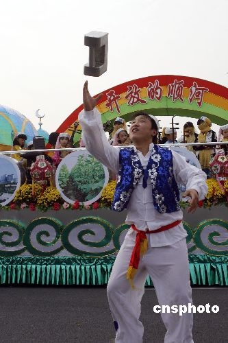 在菊花會開幕式上具有民族特色的石鎖表演。