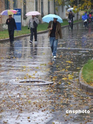 10月23日,齊齊哈爾市民走在深秋的雨中。當日,齊齊哈爾市出現降雨降溫天氣。中新社發 王云龍 攝