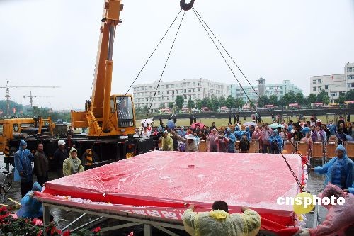 10月26日下午,四川省南溪縣豆腐干食品文化節現場,一塊長4.21米、寬4.2米、高9.5厘米左右,重達1.8噸左右的巨型豆腐干特別引人注目,它將于26日晚間揭開紅蓋頭,申報世界吉尼斯紀錄。 南溪豆腐干制作工藝因技術獨特、工藝的傳承人缺乏等原因,已被列入四川省首批非物質文化遺產目錄。這次試制的巨型豆腐干全部按照豆腐干傳統工藝制作。數十名技術骨干和工人經30多個小時的辛勤勞作,共使用了黃豆1300余公斤。中新社發 陳涌 攝