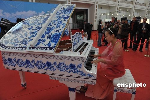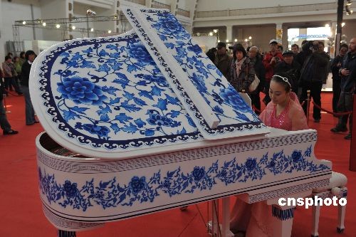 10月28日,在中國東北亞(沈陽)進口商品博覽會上,一名少女在彈奏青花瓷鋼琴,F場的工作人員介紹說,這架名為琴瓷的鋼琴是專門為前不久舉辦的國際樂器展覽會制作的,琴身上的瓷紋是由技術人員手工雕刻而成,目前在世界上僅有這一架,市場售價在46.9萬元左右。中新社發 徐建國 攝