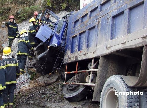 11月3日上午8時許,重慶市巴南區境內,一輛車牌為渝BC3216東風大卡車下坡時因路滑剎車失靈撞倒在山坡上,司機被困,經過消防官兵1個小時緊張救援,成功將其救出。圖為消防人員緊張施救。中新社發 張東清 攝