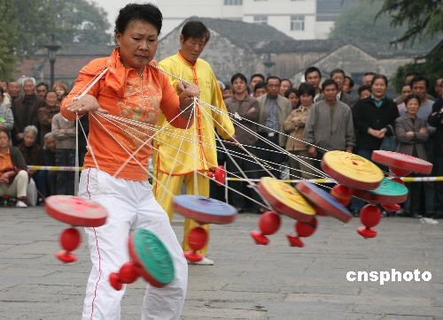 11月6日,在南京中華門城堡廣場舉行的2008中國南京第二屆民間藝術節廣場活動上,由南京市空竹協會數十位空竹愛好者展示的空竹絕技,吸引了眾多市民和游客。中新社發 鐘山 攝