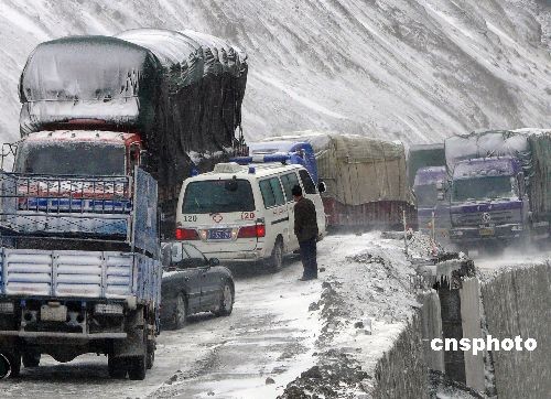 11月9日,新疆果子溝突降大雪,截止當日17點30分,共有200余輛大型車輛、500多人被堵困此路段。據了解,國道312線高速公路(賽里木湖-果子溝)施工路段路面平均積雪2厘米,個別路段達到5厘米厚度,氣溫急劇下降至零下10攝氏度左右,部分路段雪融后路面結成一層薄冰,部分大型載重車輛行至此路段“趴窩”,造成交通不暢。目前,該地段經過大批機械及人員緊張疏導,交通已基本恢復正常。中新社發 彭傳哲 攝