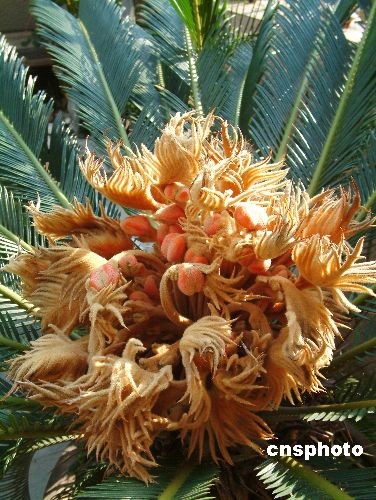 11月10日,江蘇海安縣糧食局退休干部孫道峰擺放在門口有30余年的一棵鐵樹開花,花心長出橘紅色的果實。據(jù)了解,一般鐵樹要有60至70年的樹齡才開花,鐵樹結果更為少見。中新社發(fā) 徐瑞平 攝