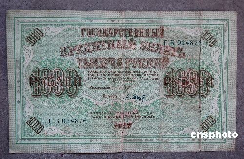 據(jù)考證,山東濱州發(fā)現(xiàn)的這張面值1000元盧布,是俄國(guó)克倫斯基臨時(shí)政府1917年在中國(guó)東北發(fā)行流動(dòng)的紙幣,它見(jiàn)證了中國(guó)的屈辱歷史。中新社發(fā) 梁寶海 攝