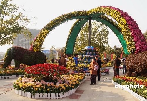 11月14日,2008年湖南婁底秋季菊花展亮相婁星廣場、青山公園和主要街道臨街窗口單位門前,展出時間為11月13日至11月28日,70家參展單位緊緊圍繞“和諧、共進”這一主題,精心構思,巧妙布展,把花展布置得花團錦簇,亮點紛呈,美不勝收,共展出各類花卉品種100多個20多萬盆。中新社發 龔高翔 攝