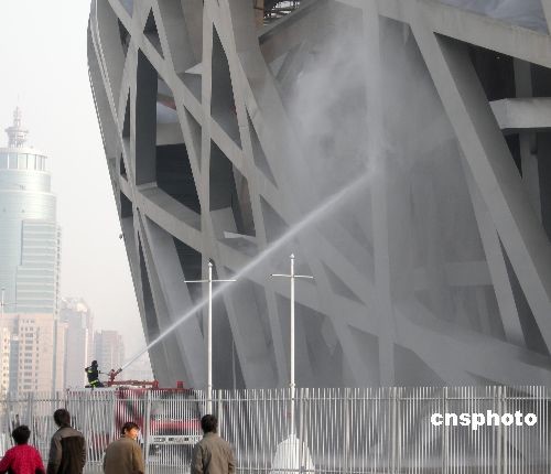 11月14日, 國家體育場“鳥巢”的鋼結(jié)構(gòu)迎來了北京奧運會結(jié)束后的第一次全面清洗。負責此次清洗任務(wù)的奧林匹克中心區(qū)消防支隊出動了兩輛消防車及68米的云梯,使用高壓水槍進行清洗作業(yè)。預計整個“鳥巢”的清洗工作大約需要1周的時間。中新社發(fā) 玉龍 攝