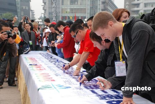 圖為中外徒步愛(ài)好者在啟動(dòng)儀式簽字。