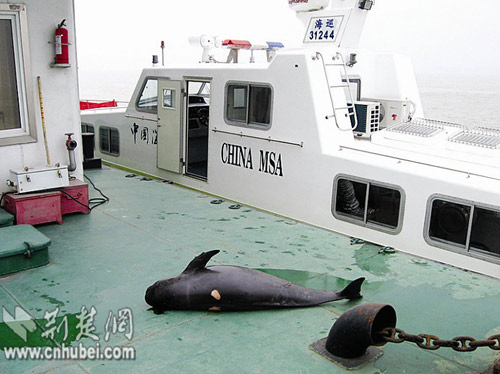 昨日中午,武漢海事局執(zhí)法人員在長(zhǎng)江龍口水道巡航時(shí),發(fā)現(xiàn)一具江豚的尸體。嘉魚縣漁政局技術(shù)人員趕來,經(jīng)鑒定,該江豚體長(zhǎng)1.45米,重約60公斤,身上有明顯的捕魚器具傷痕,是致其死亡的直接原因。