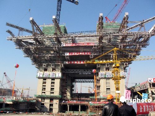 11月28日,備受外界關注的中國2010年上海世博會中國館實現混凝土結構封頂,初露雄姿。以“東方之冠”為構思主題的這一巨型展館,自2007年12月18日開工建設,總預算達15億人民幣。據了解,上海世博會中國館有望于2009年10月前完成整體建設。 中新社發 許曉青 攝