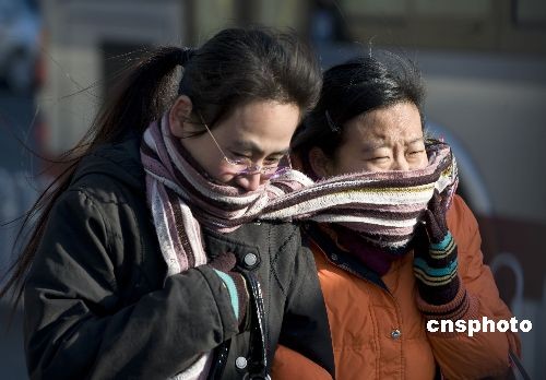 2008年12月4日,入冬以來(lái)最強(qiáng)冷空氣入侵北京,街頭兩位女士共用圍巾手套在寒風(fēng)中艱難前行。當(dāng)日,入冬以來(lái)最強(qiáng)冷空氣入侵我國(guó)大部。中央氣象臺(tái)連續(xù)兩天發(fā)布了今年首次寒潮橙色警報(bào),中國(guó)氣象局啟動(dòng)氣象災(zāi)害應(yīng)急預(yù)案Ⅲ級(jí)應(yīng)急響應(yīng)命令。中新社發(fā) 王辰 攝