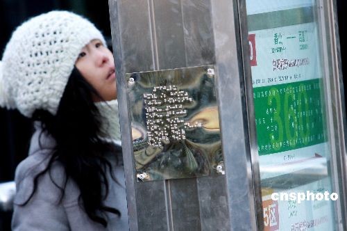 12月5日,在北京白石橋附近的一個(gè)公交站點(diǎn),盲文公交站牌的亮相吸引不少市民的目光。為了方便盲人朋友換乘公交車(chē),北京公交車(chē)站的工作人員在普通站牌上特設(shè)了具有盲點(diǎn)的盲人公交站牌,使北京交通無(wú)障礙設(shè)施進(jìn)一步得到完善,充分體現(xiàn)了首都人民對(duì)殘障人士出行的關(guān)愛(ài)和幫助。中新社發(fā) 鄭雄增 攝