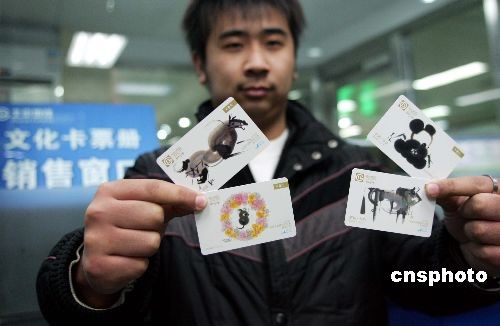 12月6日,北京市地鐵運營公司開始發(fā)行4000冊紀念文化卡票,每冊280元,這是北京軌道交通運營38年來首次發(fā)行紀念文化卡票。除機場線4個站外,北京地鐵7條線的119個站點將同時發(fā)售紀念卡票。紀念卡票特邀韓美林擔(dān)綱設(shè)計,冊內(nèi)收藏北京地鐵紀念文化卡票4張,設(shè)計以“奧運與地鐵”文化創(chuàng)意為主線,選農(nóng)歷戊子年“鼠”為首頁,以“熊貓、耕牛、駿馬”為圖,分別呈現(xiàn)“和諧、平安、耕耘、開拓”。中新社發(fā) 富田 攝