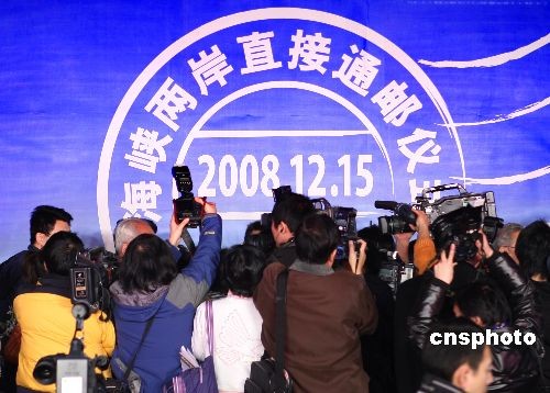 12月15日,由國家郵政局、國務(wù)院臺灣事務(wù)辦公室、北京市政府主辦、中國郵政集團(tuán)承辦的海峽兩岸直接通郵儀式,標(biāo)志著海峽兩岸將實現(xiàn)全面、直接、雙向通郵,直接開辦各項郵政業(yè)務(wù)。大陸方面郵件封局為北京、上海、廣州、福州、廈門、西安、南京、成都,臺灣方面郵件封局為臺北、高雄、基隆、金門、馬祖。圖為通郵儀式吸引眾多境內(nèi)外記者爭相采訪。中新社發(fā) 宋吉河 攝