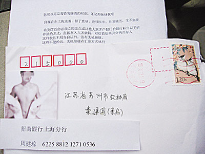 記者隨后趕到郵局看到,信有20多封,一樣的信封,一樣的郵票,一樣的筆跡。收信人是包括蘇州在內(nèi)的全國各地的民政局長,下面的落款無一例外寫的是“堂妹×××”。打開信封,里面則是一對男女的裸照。記者發(fā)現(xiàn),這些裸照除了男子的頭像不一樣,其他一模一樣,信是電腦打印的,20多封信的內(nèi)容都一樣,內(nèi)容大概是“您應(yīng)該還記得春宵纏綿的時刻,還記得妹妹我吧”,“收到信后你必須立即到開戶銀行柜臺以無折存款的方式,直接存入八萬塊錢”……另外就是一個叫“周建瓊”的人的銀行賬號。