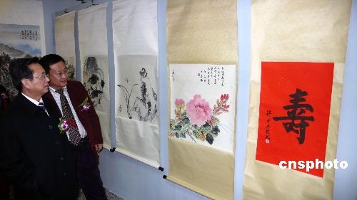 “兩岸文化交流展暨文化創意產業論壇”十九日在北京開幕,展出了蔣介石、宋美齡、馬英九、連戰等兩岸名流的書畫作品。中新社發 徐長安 攝