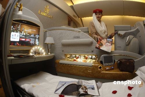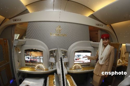 12月23日,“阿聯(lián)酋航空波音B777-200LR型飛機(jī)展示活動(dòng)”在北京首都國際機(jī)場舉行,介紹其即將在北京往返迪拜的EK306/307航班上啟用波音B777-200LR型飛機(jī),該機(jī)型安裝了頭等艙私人包間,可隨意開關(guān)的屏風(fēng)為乘客打造極致私密的空間,并配備了個(gè)人專屬儲(chǔ)物空間、衣櫥、梳妝臺(tái)及個(gè)人迷你酒吧、加長型平躺座椅等。遍布機(jī)艙的 “星空模擬”情緒照明系統(tǒng)可以幫助乘客調(diào)整生物鐘,減少因倒時(shí)差而帶來的身體不適。圖為美麗空姐介紹頭等艙私人包間特色細(xì)節(jié)。中新社發(fā) 盛佳鵬 攝