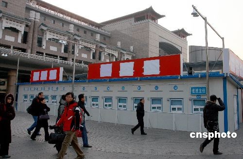 12月26日,北京西站廣場上搭建起“臨時售票窗口”,為2009年春運做準備。2009年春運將從元月11日至明年2月19日結束,為期40天。今年春運的特點是學生流和民工流探親流三流重疊,春運壓力空前集中。針對近日來迅猛增長的節前客流,為方便旅客購票,春運期間北京站和西站會將在站前廣場開辟臨時售票窗口,方便旅客購票。中新社發 鄭雄增 攝