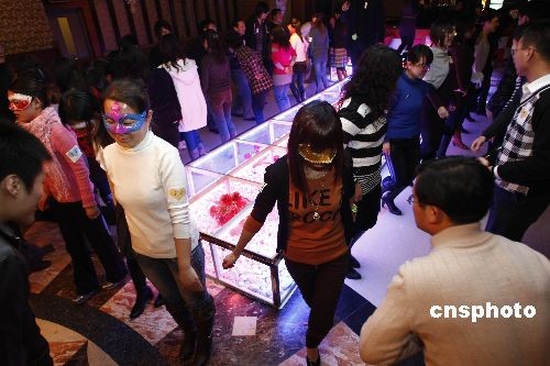 12月27日,百余名單身青年在北京參加一場化妝舞會。年輕人在歡快的樂曲中翩翩起舞。面具下的女青年拋開羞澀,與男舞伴竊竊私語。該活動的初衷也是為了引導年輕人在擇偶時拋開外在條件,認識到“相容成就幸福婚姻”才是健康婚戀理念。中新社發 楊影懿 攝