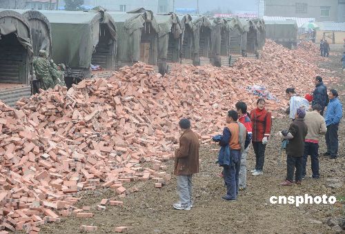 2009年元旦節,解放軍成都軍區重返地震災區的運輸部隊冒著余震小雨,從重慶為重災區北川縣曲山鎮災民無償運來重建家園急需的紅磚。中新社發 賈國榮 攝