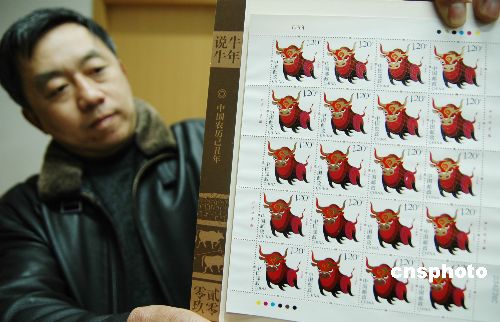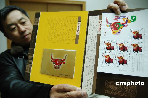 2009年1月4日,即將發行的《己丑年》特種郵票運抵蘇州。據悉,國家郵政局和中國郵政集團公司將于1月5日在蘇州首發該套以“奔牛”為形象的《己丑年》特種郵票。該次發行的《己丑年》郵票一套一枚,面值1.2元。郵票圖案為健壯倔強的奔牛形象,表現出奮力向前的視覺效果,寓意人們對生肖牛年的期望與寄托。中新社發 朱子寒 攝