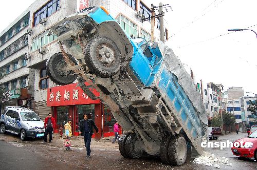 1月7日,貴州省福泉市一輛嚴(yán)重超載的汽車在某道路倒車時(shí)因后箱貨物較重將汽車“壓趴”,汽車前身高高翹起,所幸未造成人員傷亡。 中新社發(fā) 楊榮 攝