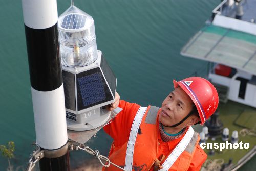 2009年1月8日,在三峽重慶庫區云陽段,航道管理人員在安裝新型太陽能航標燈。這種航標燈集太陽能光板、蓄電池、燈具于一體,視距更長、靈敏度更高、耐用性更好,可有效解決三峽庫區江面增寬和霧氣較大給船舶航行帶來的影響。目前,三峽庫區航道管理部門正在陸續更換,僅云陽縣就有30只新型太陽能航標燈在春運期間投入使用。中新社發 劉小洋 攝