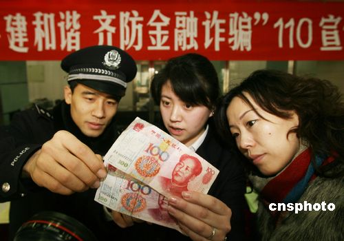 1月10日,北京110迎來第十三個宣傳日。北京崇文區警方向市民講解識別假幣的知識。中新社發 胡建強 攝
